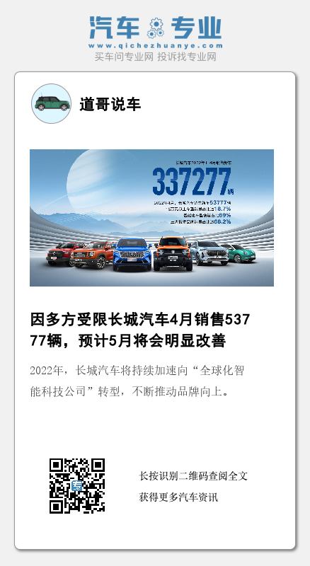 5月9日,长城汽车股份有限公司(股票代码:601633.SH,02333.HK;以下简称长城汽车)发布2022年4月产销数据。今年1-4月,长城汽车共销售337,277辆,4月销售53,777辆,海外销售7,733辆。