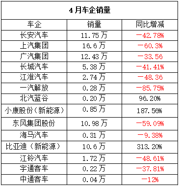 4月车企销量普遍腰斩 比亚迪一枝独秀