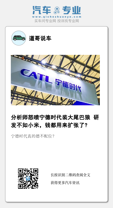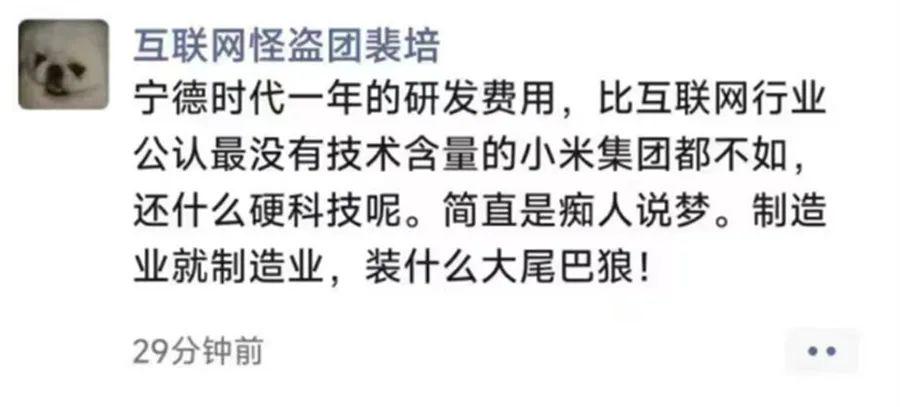 【文/道哥说车 听风吟】“宁德时代一年的研发费用,比互联网行业公认最没有技术含量的小米集团都不如,还什么硬科技呢。简直是痴人说梦。制造业就制造业,装什么大尾巴狼!”,这是国金证券研究员裴培在朋友圈对宁德时代的评价。