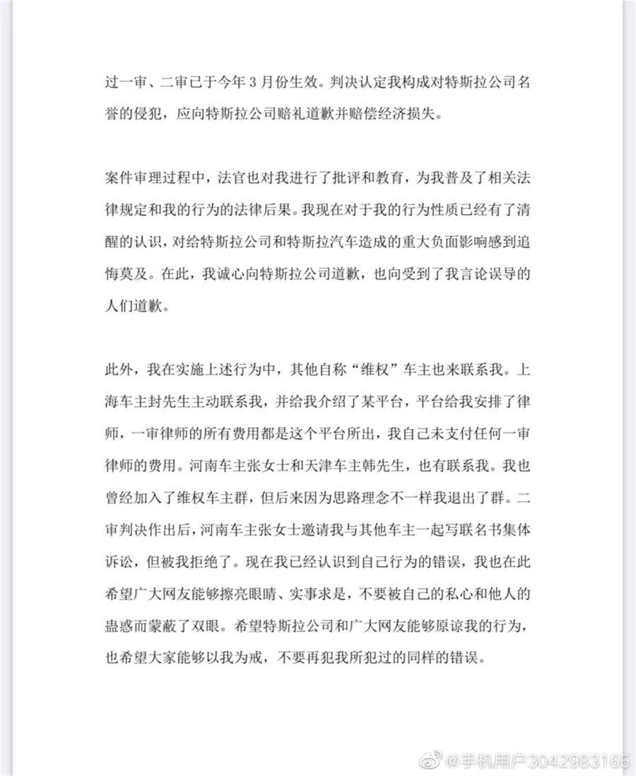 在温州特斯拉失控车主的道歉信中,不仅承认了其捏造“刹车失灵”的“事实”,同时也波及了几个曾经的战友。该博主在信件最后提到,在“维权”期间,有其他自称“维权”的车主联系该博主。上海车主封先生给该车主介绍了某平台,该平台为其安排了律师并承担一审所有律师费用。此外,河南车主张女士和天津车主韩先生也有联系该博主。二审判决作出后,河南车主张女士邀请该博主与其他车主写联名书集体诉讼,但被该博主拒绝。