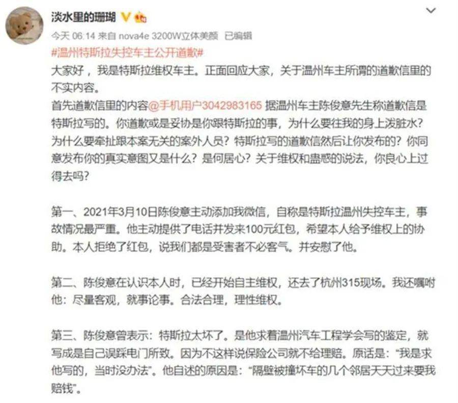 值得关注的是,温州特斯拉失控车主在道歉信中还提及了他曾经的“战友”,颇有些提醒吃瓜群众的意味。而其提到的车主也相应对号入座,只是却对温州特斯拉失控车主的行为表示愤慨,其中上海车展维权车主更直言其泼脏水。