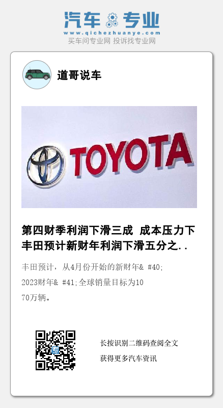 或基于此,丰田汽车警告称,由于原材料和物流成本空前增长,预计当前财年的材料成本将增加逾一倍至1.45万亿日元(合111亿美元),营业利润可能会下滑五分之一至2.4万亿日元。与此同时,丰田预计,从4月份开始的新财年(2023财年)全球销量目标为1070万辆。