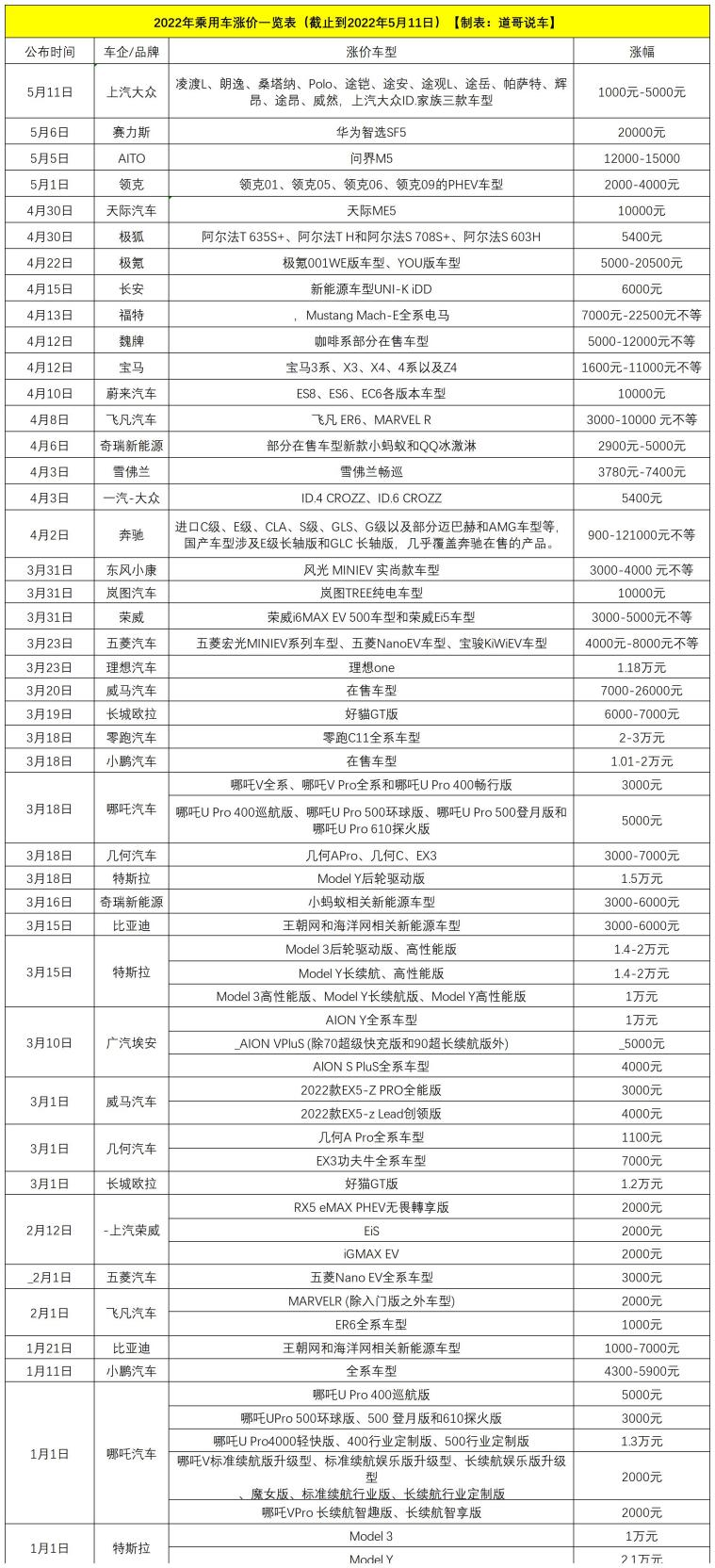 【文/道哥说车 悦悦】受芯片短缺、原材料价格上涨、俄乌局势、疫情方面等影响,今年以来,各大汽车品牌纷纷涨价,在这场史无前例的汽车制造业巨大压力下,率先受到冲击的是新能源汽车企业。自2022年开年以来,以特斯拉为首的众多新能源汽车品牌纷纷涨价,有些汽车品牌甚至今年以来涨价两三次。