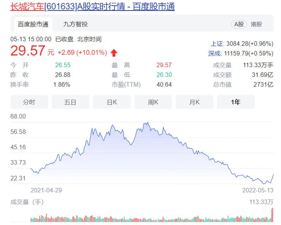 【文/道哥说车 听风吟】今年以来,长城汽车在资本市场中可谓跌跌不休,甚至市值一度缩水超过50%,然而自5月11日起,长城汽车股价却强势反弹,截至当月13日收盘,长城汽车涨超10%,报收29.57元。尽管相比其接近70元/股的巅峰时期还差很远,但在长期跌跌不休的背景下,无疑让长城汽车成为了市场关注的焦点。