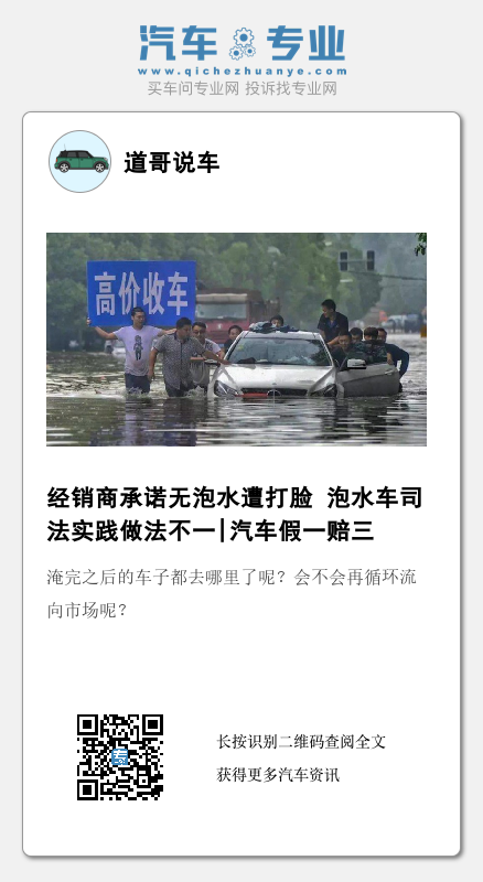 据了解,雨中浸泡过的汽车中一部分被报废,一部分会变成零配件,还有一部分会被一些逐利的二手车商们收下,通过精洗翻修,然后以正常二手车的形式,流入市场,在一些被淹过的地区不乏出现一些收车的标语。