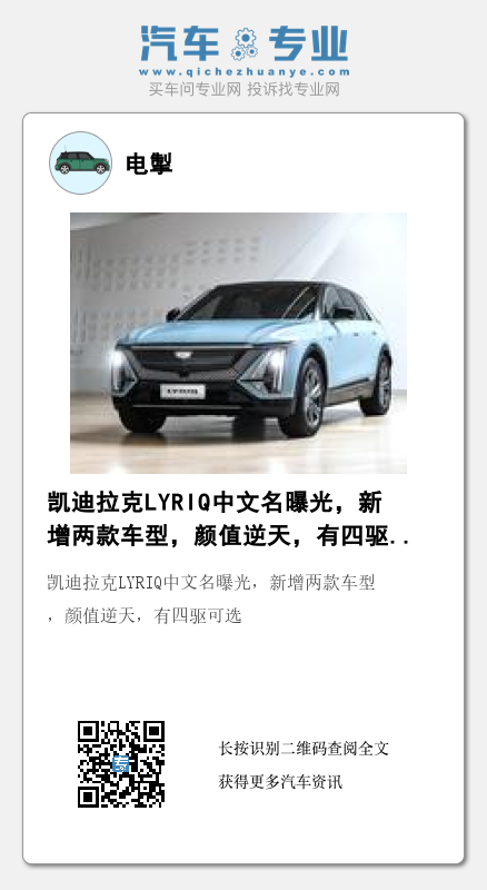 随着BBA等豪华品牌进军电动化市场,凯迪拉克也不甘落伍,推出了其旗下的首款电动SUV车型——凯迪拉克LYRIQ。近期,凯迪拉克宣布LYRIQ的中文命名是锐歌,车名非常有寓意,代表着锐意进取,歌咏言志。另外,官方还透露了后驱长续航尊贵版和四驱高性能尊贵版两款车型的信息。