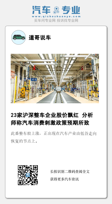 从消息上看,此轮整车股焕发青春正值汽车消费刺激政策层出不穷的背景之下。4月25日,国务院印发《关于进一步释放消费潜力促进消费持续恢复的意见》中提出,鼓励和引导大型商贸流通企业、电商平台和现代服务企业向农村延伸,推动品牌消费、品质消费进农村。以汽车、家电为重点,引导企业面向农村开展促销,鼓励有条件的地区开展新能源汽车和绿色智能家电下乡,推进充电桩(站)等配套设施建设。