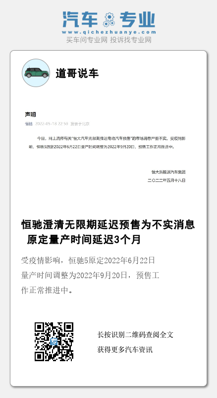 道哥说车5月19日消息,恒驰”公众号18日晚发文称,网上流传有关“恒大汽车无限期推迟电动汽车预售”的市场消息严重不实。受疫情影响,恒驰5原定2022年6月22日量产时间调整为2022年9月20日,预售工作正常推进中。