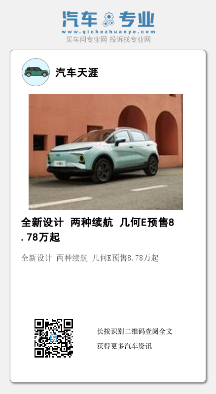 目前,尺寸小巧、价格不高的纯电动车型仍有不小的市场空间,比如哪吒V(7.49-12.38万)、元Pro(9.28-13.14万)和零跑T03(7.39-8.99万)在这一细分市场都取得不错的销量,此次全新设计的几何E确实让人耳目一新,自然也会加入到激烈的竞争中,具体的表现究竟如何?你们怎么看呢?欢迎留言讨论。