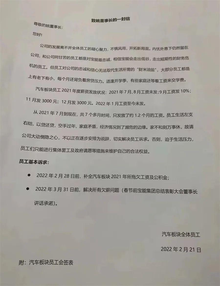 此前,社交平台中流露出一份落款日期为2022年2月21日的宝能汽车板块员工《致姚董事长的一封信》。在该信件中,详细列出了汽车板块员工2021年7月至2022年1月员工薪资发放状况。从信件内容看,宝能汽车板块员工被拖欠薪资已经超过半年之久。与此同时,信件中还列举了员工几个基本诉求,包括补全所欠工资及公积金,解决欠薪问题等。