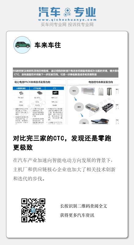 零跑汽车作为造车新势力第一梯队车企之一,此次提出的CTC方案相对来说更具前瞻性,未来也将在这一领域拥有更多主导权。当然,作为一家还处于成长阶段的整车企业,零跑汽车对动力电池的更新迭代,背后离不开其所一贯秉承的创新精神。