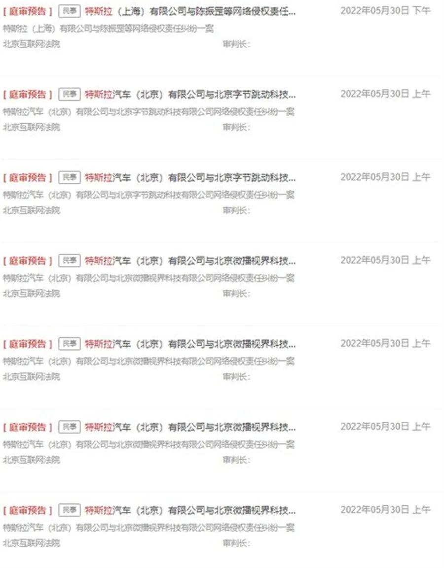 值得一提的是,除了起诉媒体和车主,在中国庭审公开网上,《道哥说车》编辑还注意到,微博和抖音平台也遭遇过特斯拉的起诉,光是5月30日开庭的就有7条,包括北京字节跳动科技有限公司、北京微播视界科技有限公司(抖音)和汽车评测自媒体人“小刚学长”。可见,特斯拉法务部的成立还真不是闹着玩的,干了不少事情,试想一下干掉这么多说话的人,以后还会有人敢说特斯拉一句不好吗?