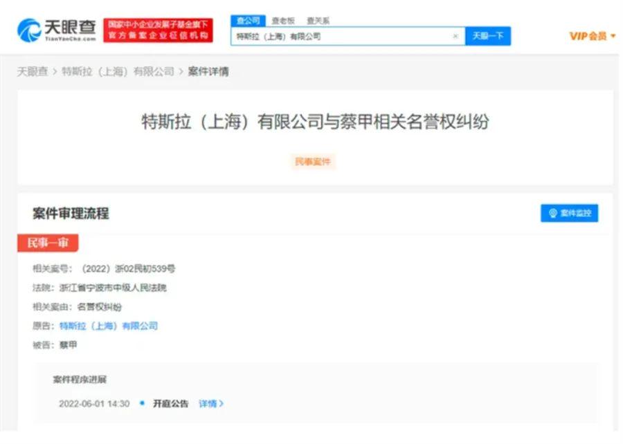 【文/道哥说车 悦悦】近日,特斯拉(上海)有限公司与蔡甲相关名誉权纠纷新增开庭公告,原告为特斯拉(上海)有限公司,相关案件将于6月1日在浙江省宁波市中级人民法院开庭。据了解,被告蔡甲是一位车评人,抖音账号“蔡老板”,特斯拉要求蔡老板书面道歉,并赔偿500万。