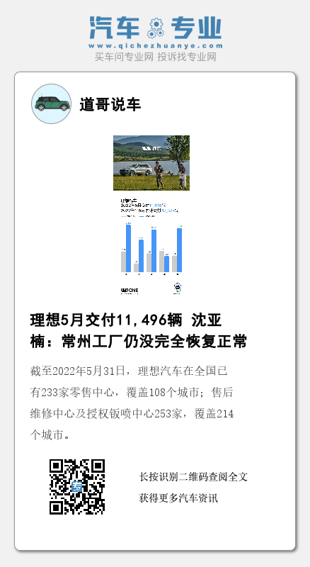 截至2022年5月31日,理想汽车在全国已有233家零售中心,覆盖108个城市;售后维修中心及授权钣喷中心253家,覆盖214个城市。