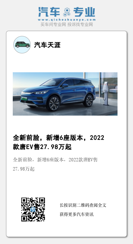 总结:作为中期改款车型,新款唐EV的外观变得更漂亮了,配置上也进行了很多升级,并且新增6座版本满足不同的消费需求,不过新车售价相对于现款也上升明显,不知道消费者会不会为此买单,你怎么看?欢迎留言评论。