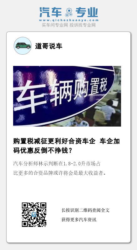 值得关注的是,此次购置税减征细则发布后,车企们纷纷加码优惠,截至目前已经有近20家车企公布基于购置税减征的优惠政策。某合资车企高管就此对《道哥说车》编辑表示,竞争激烈,不得不为,甚至其提到,最后很有可能搭钱进去。