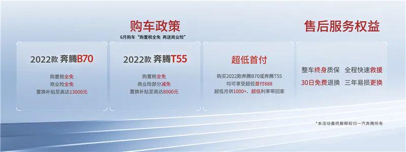 其中,2022款奔腾B70可享购置税全免、商业险全免,置换补贴至高达13000元。2022款奔腾T55可享购置税全免、商业险部分减免,置换补贴至高达8000元。同时,两款产品均可享受超低首付888、超低月供1000+、超低利率带回家。此外,用户购车均可享售后服务权益,包含整车终身质保、30日免费退换、全程快速救援、三年易损更换等。