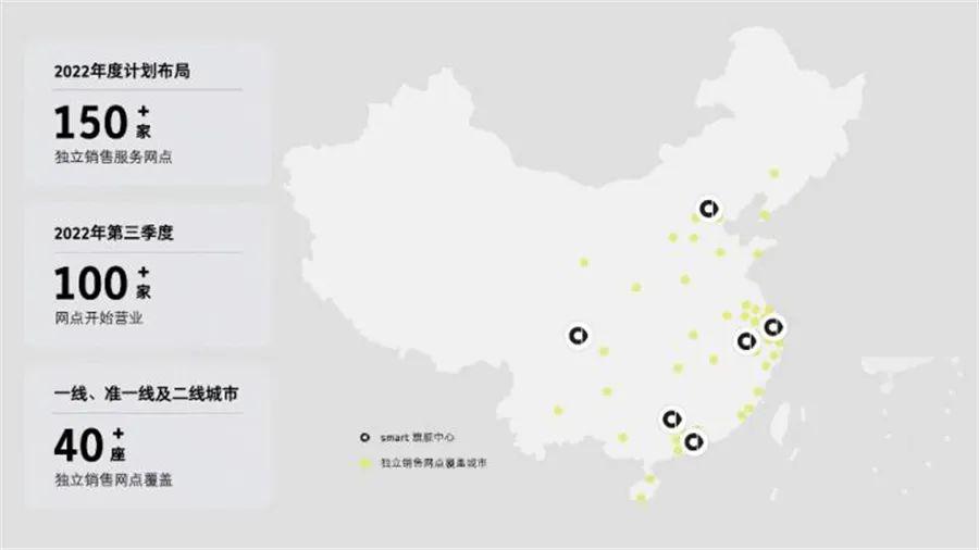 除价格、产品给力外,smart品牌独立销售服务网点也正快速铺陈。据悉,首批smart展厅即将惊喜揭幕,全球首家smart旗舰中心也会很快开业。此外,smart今年将有超过150家独立销售服务网点完成布局。预计到第三季度,smart会有100余家独立销售服务网点开始营业,覆盖超过40座一线、新一线及二线城市。