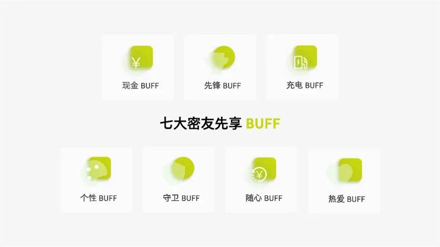 个性BUFF上考虑到了用户的个性化需求,在9月30日(含)前下定Premium配置车型,并选择付费颜色(镭射红、流明黄、时空蓝、时光绿、波普粉、哑光灰)的密友,可获得人民币2,000元车辆尾款抵扣,个性化颜色搭配还能额外享受到优惠也是相当难得。