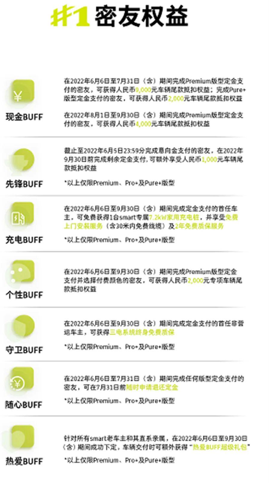 全新smart精灵#1此次推出的七大密友权益每一项都踩在了用户关注的问题上。现金BUFF上,凡在6月6日至7月31日(含)期间下定Premium配置车型,可获得人民币9,000元车辆尾款抵扣权益,下定Pure+配置车型,可获得人民币2,000元车辆尾款抵扣权益;8月1日至9月30日(含)下定Premium配置车型,可获得人民币4,000元车辆尾款抵扣权益。