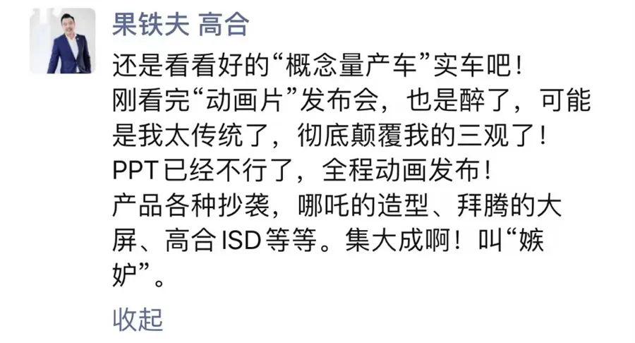 比如高合汽车市场与公共传播高级总监果铁夫怒批道,“彻底颠覆三观”、“集大成啊!,叫‘嫉妒’”,至于原因则集中在ROBO-01的发布过程实在太过科幻,果铁夫直言:PPT已经不行了,全成动画发布。对于这款概念车最终到量产车上的完成度,《道哥说车》编辑也是抱有一丝疑虑的,尽管集度“量产车型拥有与ROBO-01概念车90%的相似度”的强调在先,但百度CEO李彦宏口中“集度的目标市场是家庭用车,产品定价在20万元左右”的预告还是令人不免猜疑,集度会不会出现“概念林志玲,量产罗玉凤”的经典画面?