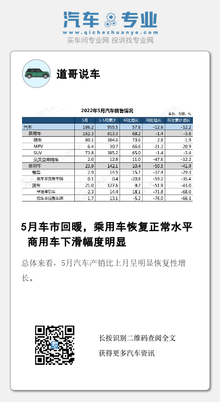 6月10日,中国汽车工业协会公布了2022年5月汽车市场运行状况,数据显示,5月国内汽车产销分别完成192.6万辆和186.2万辆,环比分别增长59.7%和57.6%,同比分别下降5.7%和12.6%。1-5月,汽车产销分别完成961.8万辆和955.5万辆,同比分别下降9.6%和12.2%。
