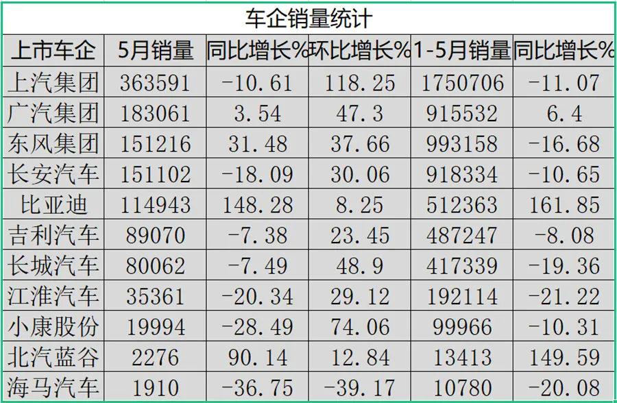 今年3到4月,受长春、上海等汽车产业核心地区影响,国内车市增长状况较差,尤其在4月份,车市更是到达至暗时刻,绝大多数车企销量均遭受腰斩。而随着疫情状况转好,5月的车市也恢复了一些元气。从上述表格不难看出,11家上市车企中,除海马汽车外,其余车企在5月销量尽管同比仍大多下滑,但环比增幅均比较明显,展示了车市较强的恢复态势。