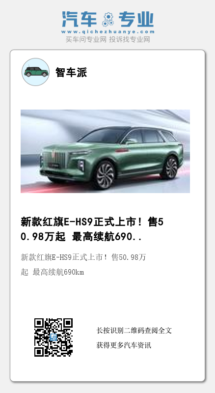 日前,智车派从红旗官方了解到,新款红旗E-HS9(图片|配置|询价)正式上市,新车推出了8款车型,售价区间为50.98万~77.98万。8款车型分别是460km旗悦版、690km旗悦版、460km旗享版、690km旗享版、510km旗畅版、660km旗畅版、510km旗领版、660km旗领版。红旗官方表示,本次推出的新车在外观与内饰上依旧延续了现款车型的设计,而在配置方面进行了升级优化。