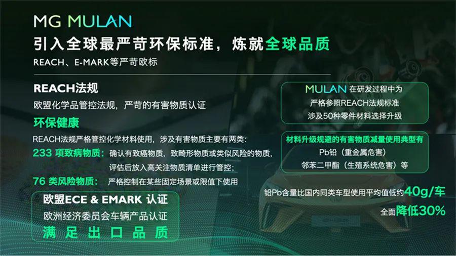 值得关注的是,在安全方面,MG MULAN以欧洲五星安全标准研发,采用了三重防撞梁设计、CPM电容应用等。此外,在电池安全防护上,MG MULAN对电池安全防护上做了大幅升级,使得MG MULAN能真正满足全球安全的水平。在环保方面,MG MULAN不仅满足国内标准,还满足欧盟REACH、E-MARK品质认证,而这也是其作为全球车型的看点之一。而这些,包括上述所提到的MG MULAN的性能表现都将成为支撑这款车口碑的一环。