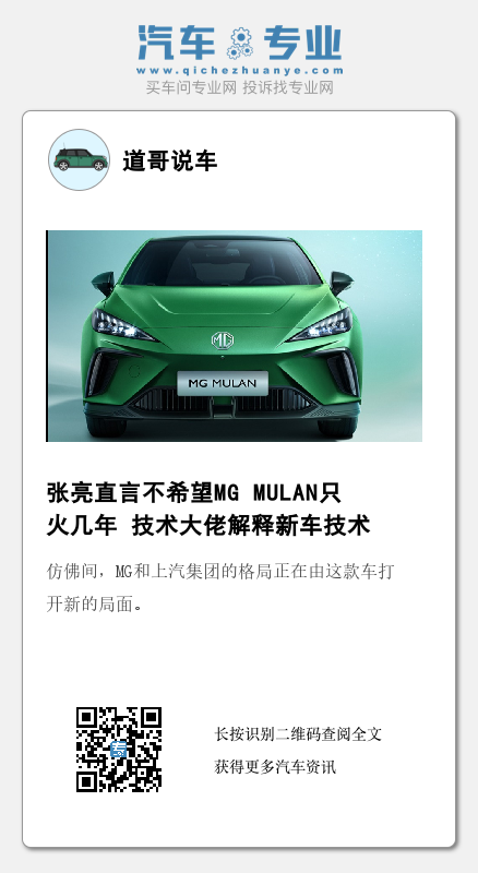 在张亮看来,MG MULAN绝活是它的综合实力,他不希望MG MULAN是一个在市场上火了几年就悄无声息的产品,而希望MG MULAN是一款经久不衰的全球车型,所以MG MULAN必须有能足够支撑口碑的综合实力,这些实力是性能、安全等等,来自于MG MULAN所诞生的平台,来自于它所搭载的技术,来自于它的生产标准。