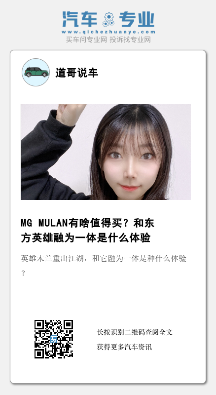 英雄木兰重出江湖,和它融为一体是种什么体验?今天我们就来聊聊MG MULAN。这是名爵的一款全新纯电动跨界车,之所以叫木兰是因为木兰是享誉全球的东方英雄,也是是充满力量、勇于突破、始终坚持自我的“木兰精神”的代名词。整车外观看上去还是很名爵的,年轻、时尚、充满力量。作为一款纯电车,MG MULAN搭载由宁德伊控动力系统有限公司所生产的三元锂电池组并配备“零热失控”防护体系,符合欧洲五星安全标准设计,能够对电池进行多重防护。还有还有这款车最快(四驱前后电轴)可实现3.8秒破百还是很酷的吧!