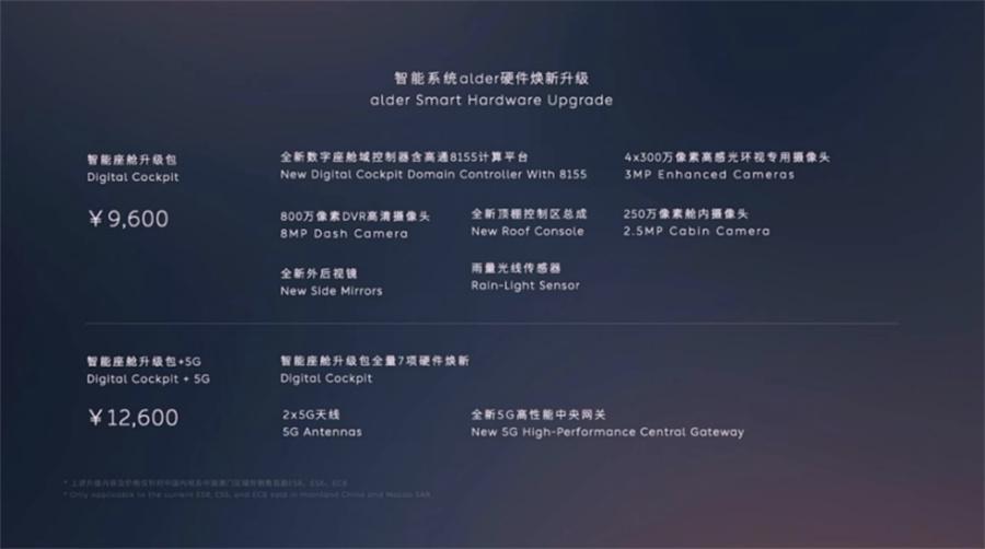 此外,蔚来还推出了智能座舱升级包。旧款ES8、ES6、EC6的用户可选择付费升级搭载骁龙8155芯片的alder智能座舱平台,包括内部芯片与外部相关套件。座舱升级包为9600元,座舱升级包+5G套件为12600元。该服务6月30日预定,7月中旬开启升级服务。