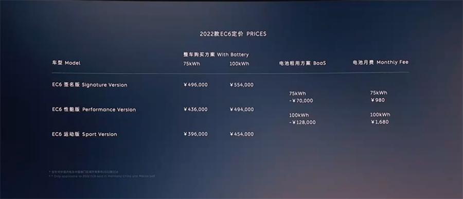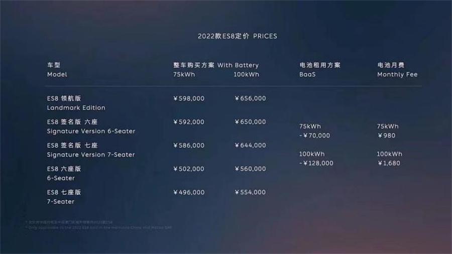 2022款ES8选择标准电池续航电池包,按整车购买补贴前价格49.6万元起;采用BaaS电池租用方式购买,补贴前车价42.6万元起;2022款ES6选择标准电池续航电池包,按整车购买补贴前价格38.6万元起;采用BaaS电池租用方式购买,补贴前车价31.6万元起;2022款EC6选择标准电池续航电池包,按整车购买补贴前价格39.6万元起;采用BaaS电池租用方式购买,补贴前车价32.6万元起。