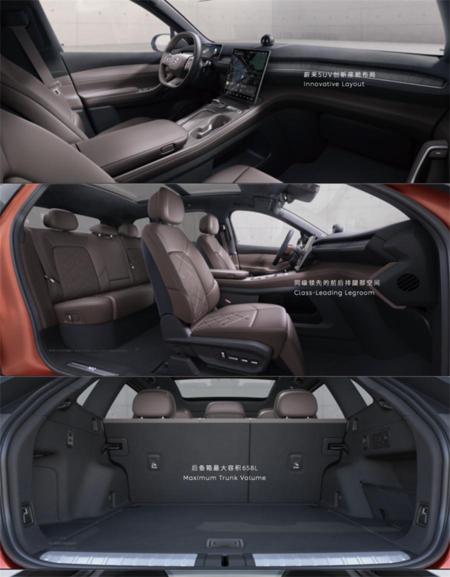 内饰上,延续“第二起居室”理念。2960毫米轴距赋予了蔚来ES7宽敞的移动生活空间,前排空间采用双层S-Shape造型仪表盘的设定;配合环绕造型的Karuun®可再生藤木,呈现出前后贯通的环抱式座舱设计,为车内带来宽阔的纵向及横向空间;前排标配女王副驾,前排座椅标配加热、通风及按摩;后排标配座椅加热,靠背支持23°—31°无极电动调节,并可4/6放倒。