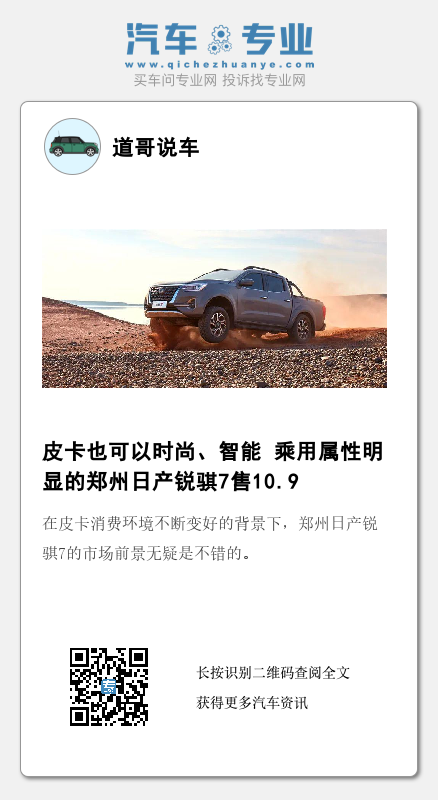近年来,越来越多像皮卡车型从设计出发点上,就考虑的是“乘用化”,而非“货运用途”,它们的舒适性、越野能力等方面表现得不比传统越野车和SUV差,绝不是传统概念上的“货运工具皮卡”,而像郑州日产锐骐7这样的车型便是代表性车型,且从产品角度来看,这款车也有着比较高的性价比,在皮卡消费环境不断变好的背景下,郑州日产锐骐7的市场前景无疑是不错的。