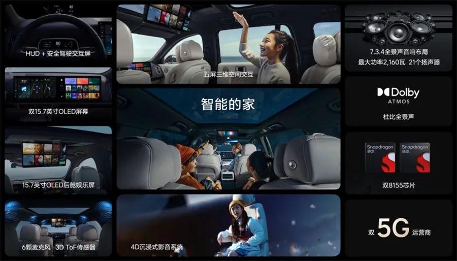 为了给车载软件、影音等提供强大的算力,理想L9标配两颗高通骁龙8155芯片,配合24GB内存和256GB高速存储组成计算平台。音响系统方面,理想L9采用7.3.4全景声音响布局,由7组扬声器组成全车环绕,3个重低音单元组成低音矩阵,4个顶部扬声器组成天空环绕,采用杜比全景声技术,配备4D沉浸式影音系统。理想L9车身提供了更大的声学腔体容积,全车拥有21个扬声器,功放最大功率达2160W,可以说是汽车标配音响中的天花板。