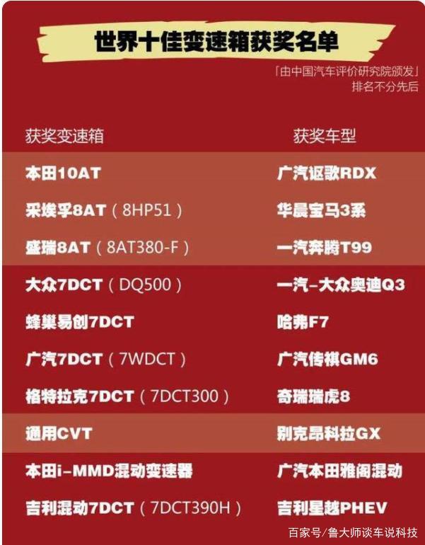 2020年,汽车评论研究院公布的第三届世界十佳变速箱获奖名单中,前十款变速箱,国产品牌占了4席,分别是一汽奔腾T99所搭载的盛瑞8AT、长城哈弗F7所搭载蜂巢易创7DCT、广汽传祺GM6搭载的广汽7DCT以及吉利星越PHEV搭载的吉利混动7DCT变速箱,这四款变速箱都是纯正的“中国制造”。