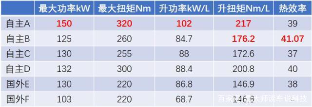 自主A升功率高达102kW/L,升扭矩高达217Nm/L,热效率也达到了39%,自主B热效率尽然高达41.07%!需要大家注意的是,这里的升功率“破百”并不是指马力破百,而是指功率破百,这一数据已经基本吊打所有同级别的发动机了。