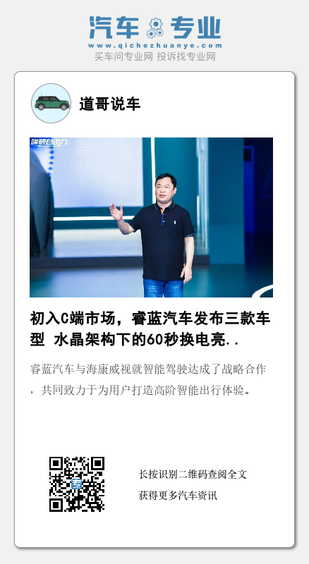 睿蓝汽车与海康威视就智能驾驶达成了战略合作,双方就智能驾驶技术、自动驾驶等领域进行深度合作,共同致力于为用户打造高阶智能出行体验。此外,睿蓝汽车还与普惠名车达成了战略采购合作,睿蓝汽车将为普惠名车提供大批量定制换电车型,赋能换电出行市场。共同为睿蓝汽车的换点版图注入了新活力。