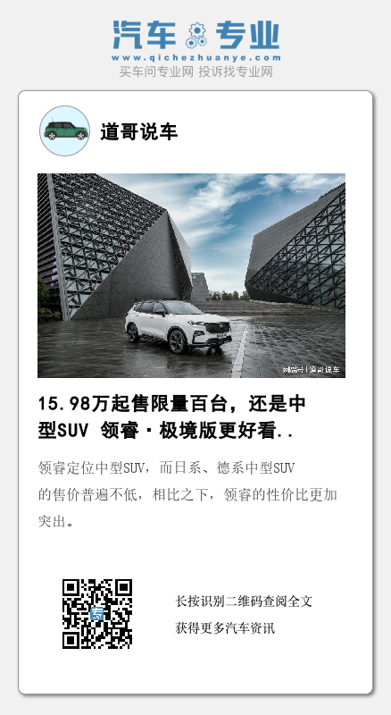 从车型来看,在使用角度领睿·极境版并没有比普通版车型有更多的优势,但其的确可以提供给车主一个独特的领睿车主身份,更重要的是,限定以及官改的身份将很大程度的提升江铃福特在乘用车市场中的知名度。让越来越多的消费者认识到江铃福特也有乘用车可以买,或许是江铃福特推出领睿·极境版的一大原因之一。