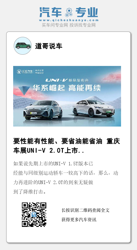 6月25日重庆国际车展上,长安UNI-V 2.0T正式迎来上市,新车共推出共推出“锋速版”和“领速版”两款车型,售价分别为12.99万、13.99万元,并提供畅享音质包、舒适驾享包、酷动音浪包、哑光风暴灰四大选装包。另外,UNI-V 2.0T还推出V·享品质、V·享金融、V·享焕新、V·享改装、V·享驾趣共五重V享权益。与此同时,大家期待已久的混动版UNI-V iDD也迎来全球首次亮相,向消费者展示UNI家族领先技术实力和品牌魅力。
