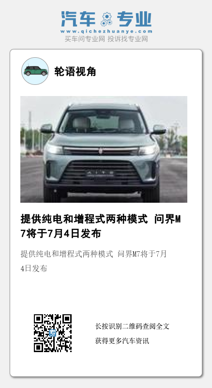 日前我们从相关渠道获悉,AITO问界M7(图片)将于7月4日举办的华为夏季新品发布会上正式发布。新车定位中大型SUV,高于问界M5,动力上仍提供纯电和增程式两种供选。外观方面,新车采用家族式的设计语言。前脸部分的LED头灯组通过狭长的进气口相连形成贯穿式设计。