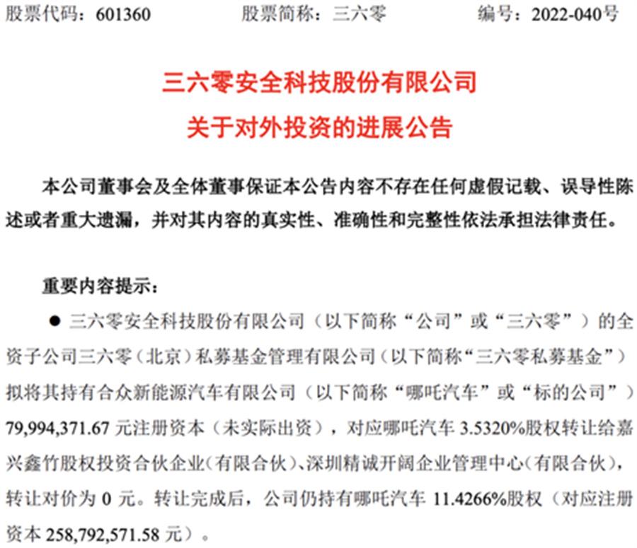 【文/道哥说车 听风吟】6月26日晚,三六零安全科技股份有限公司(下称“360”)发布公告称,三六零全资子公司三六零私募基金拟将其持有的合众新能源汽车有限公司(下称“哪吒汽车”)3.53%股权转让给两家有限合伙企业,转让对价为0元,对应投资额为10亿元。