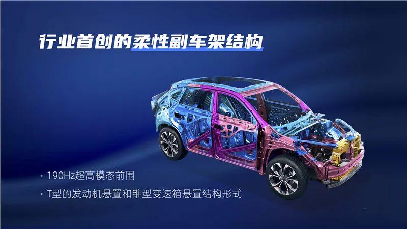 同时,该车型的车身扭转刚度高达25000Nm/deg、车身模态高达45Hz,强壮的结构设计,有效降低来自底盘及路面的激励,同时抑制发动机振动噪声。T型发动机悬置和锥型变速箱悬置结构形式,既保证可靠的结构强度,又提供10倍的隔振率。190Hz超高模态前围,有效降低发动机振动带来的整车响应。