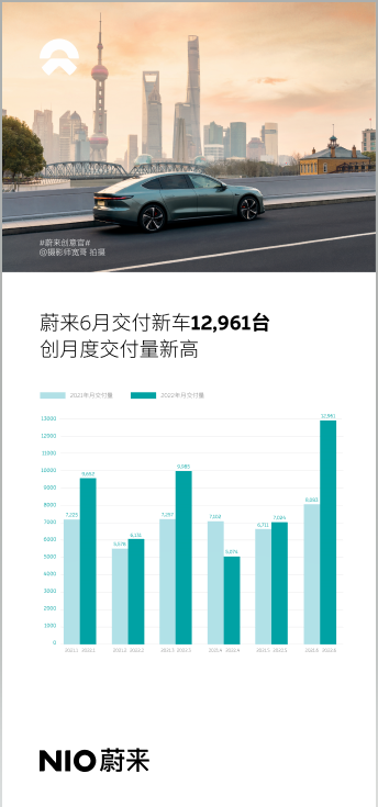 7月1日,蔚来公布2022年6月交付量,共交付新车12,961台,同比增长60.3%,创月度交付量新高。2022年第二季度蔚来累计交付新车25,059台,同比增长14.4%,连续9个季度同比正增长,超2022年二季度交付指引。2022年1-6月,蔚来交付新车50,827台,同比增长21.1%。蔚来车辆累计已交付217,897台。6月,蔚来供应链和整车生产已全面恢复,上海等地的交付工作步入正轨;接下来,位于新桥智能电动汽车产业园区的蔚来第二生产基地也将于第三季度正式投产。6月中旬,蔚来发布智能电动中大型SUV ES7以及搭载Alder·赤杨智能系统的ES8、ES6、EC6,以上车型均将于8月开启交付。
