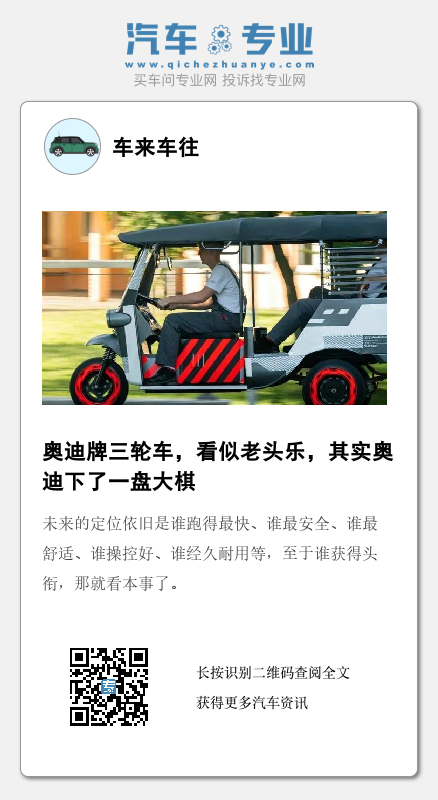 奥迪参与三轮车项目是在采集大数据,然后把电池变废为宝,循环再次利用。如果这项技术成熟了,那奥迪就可以说:我的车性价比高,不会出现30万买辆车,20万换个电池。未来的定位依旧是谁跑得最快、谁最安全、谁最舒适、谁操控好、谁经久耐用等,至于谁获得头衔,那就看本事了。