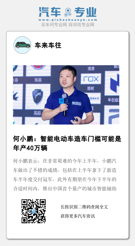 “很多人说小鹏你们一定要做到10万(辆)的年产量。当我们做到10万的时候,发现今天的智能电动汽车门槛可能已经到40万(辆)左右。”