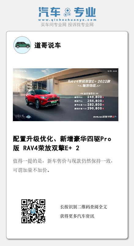 作为一款年度改款车型,RAV4荣放双擎E+2022款不仅在此前三款车型的基础上新增了豪华四驱Pro版本车型,还在车身配色以及配置方面进行升级,产品竞争力实现了大幅提升。值得一提的是,新车售价与现款仍然保持一致,可谓加量不加价。