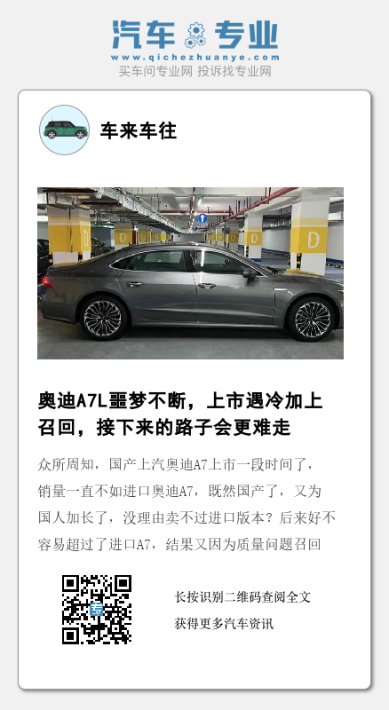 小众车加长后就一定大卖吗?再说了,买奥迪A7真正的需求是什么?奥迪A7是进口车溜背车,进口和溜背才是卖点,加长后溜背没了,进口的身份也没了,光靠价格很难把销量提上去,加上召回,上汽奥迪A7L的前途一片灰暗。