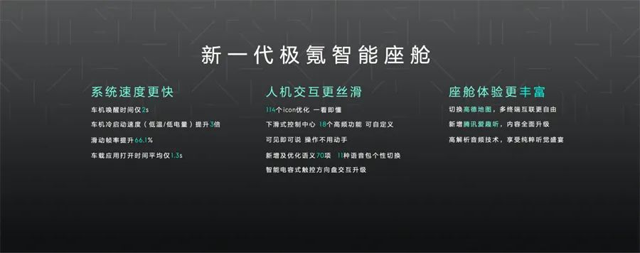 而此次新一代极氪智能座舱可谓完美解决这一问题,据悉,其采用7纳米制程8核CPU、16G内存和128G存储空间,可为用户带来更丰富的车载应用,在人机交互、图像/多媒体画质渲染和处理速率等方面均得到大幅提升。